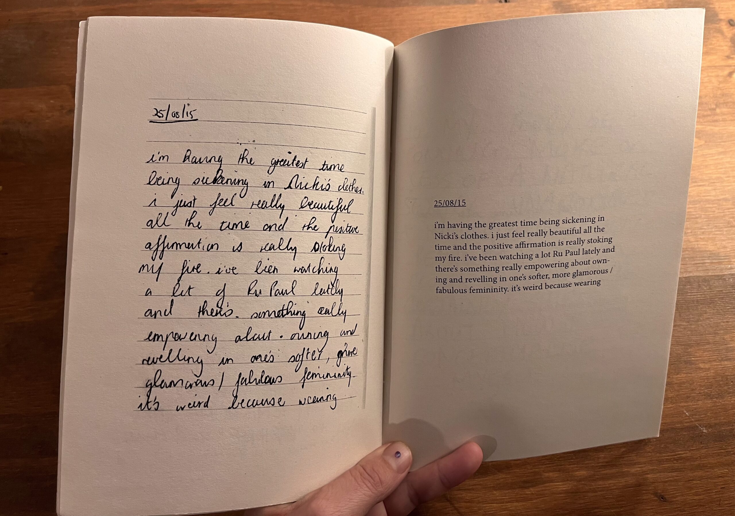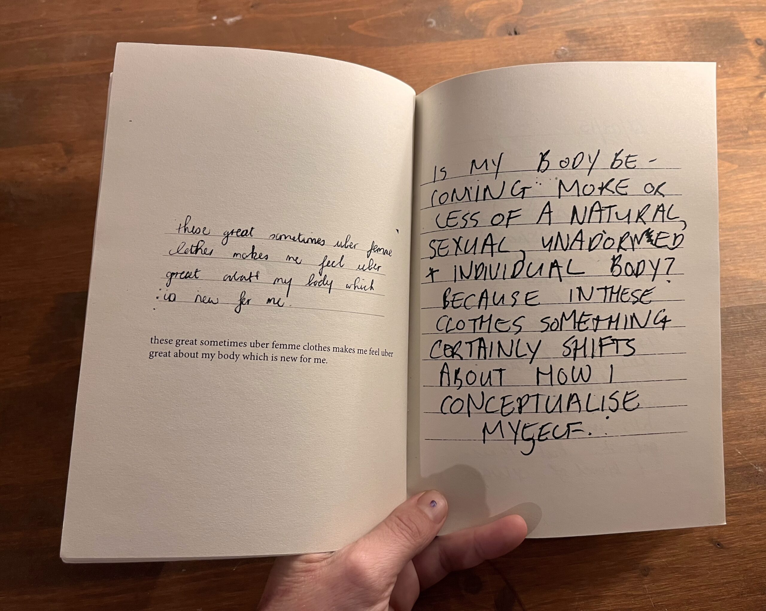 closet was a 20-minute duet created and performed by myself and Kopano Maroga. the performance was created after a research period where we swapped wardrobes for two weeks. we documented the experience through journals and made a zine out of the journals. the performance explored topics of gender identity, dress, costume and embodiment.